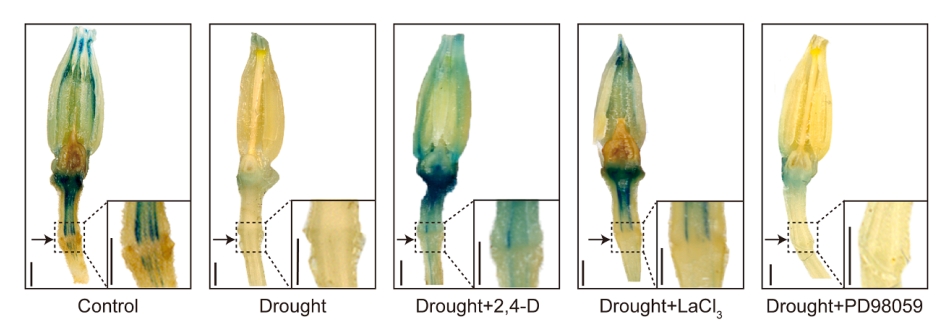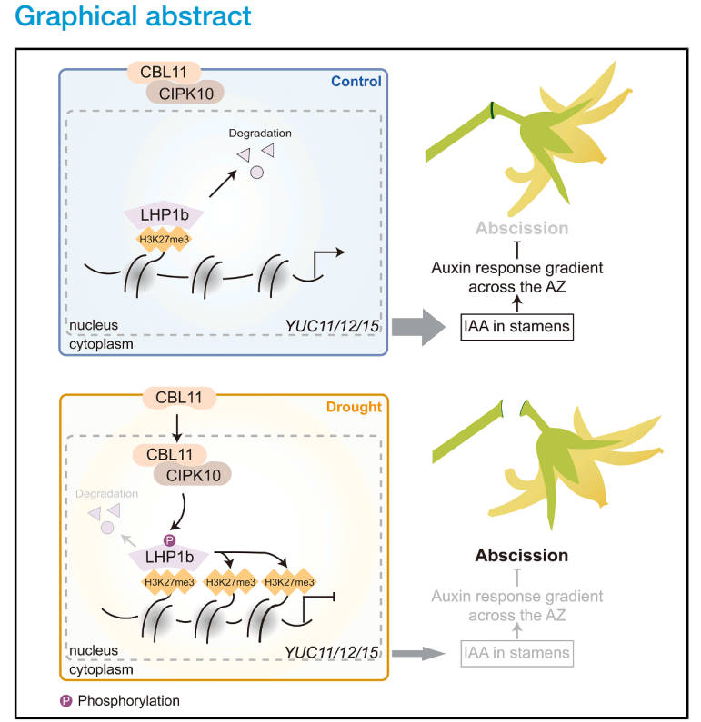 該研究發(fā)現(xiàn),干旱脅迫下SlCBL11/SlCIPK10-SlLHP1b信號模塊誘導(dǎo)番茄落花的作用機制。干旱脅迫激活SlCBL11-SlCIPK10鈣離子感受器模塊,磷酸化修飾SlLHP1b。磷酸化的SlLHP1b通過H3K27me3依賴的方式結(jié)合下游生長素合成基因SlYUCs的啟動子區(qū)域抑制其表達(dá),導(dǎo)致雄蕊中生長素合成減少,破壞離區(qū)生長素梯度,誘發(fā)番茄落花。該研究揭示了干旱下鈣信號通過表觀遺傳調(diào)控生長素合成參與番茄落花的分子機制,進一步完善了植物逆境響應(yīng)中鈣信號與表觀遺傳調(diào)控的分子網(wǎng)絡(luò),還為培育耐旱、高產(chǎn)的品種提供了潛在的基因靶點。研究成果對提高逆境下的番茄產(chǎn)量,提高經(jīng)濟效益具有重要的指導(dǎo)意義。該研究獲國家重點研發(fā)計劃項目、國家自然科學(xué)基金面上項目和青年科學(xué)基金等項目支持。
