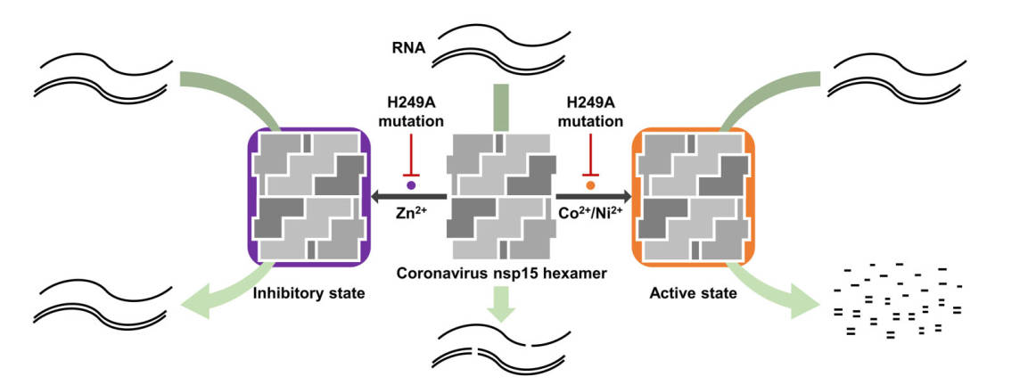 冠狀病毒nsp15被認(rèn)為是一種尿嘧啶特異性的RNA內(nèi)切酶。多項(xiàng)研究表明,冠狀病毒nsp15的活性并不直接影響冠狀病毒的復(fù)制,但會(huì)抑制宿主細(xì)胞的干擾素反應(yīng),以保證病毒復(fù)制的順利進(jìn)行。朱斌團(tuán)隊(duì)于2024年發(fā)現(xiàn)nsp15雙鏈RNA特異性的缺刻酶功能,提出其通過將冠狀病毒RNA復(fù)制中間產(chǎn)物雙鏈RNA切割成為短片段以逃逸宿主細(xì)胞雙鏈RNA監(jiān)測(cè)系統(tǒng)的機(jī)制。但關(guān)于nsp15在病毒基因組復(fù)制及逃逸宿主免疫功能方面仍存在一個(gè)重要問題,即nsp15的RNA切割如何進(jìn)行精確調(diào)控,確保病毒RNA復(fù)制過程中其切割活性完全被抑制,而復(fù)制完成后雙鏈RNA中間產(chǎn)物立即被高效切割去除。這一必然存在的調(diào)控機(jī)制是冠狀病毒基因組復(fù)制與免疫逃逸的關(guān)鍵平衡點(diǎn),對(duì)冠狀病毒生活史具有重要意義,然而在冠狀病毒研究領(lǐng)域該機(jī)制數(shù)十年來(lái)成為研究空白。