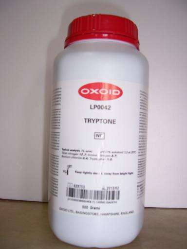 說明:Tryptone is a pancreatic digest of casein. It is notable for the absence of detectable levels of carbohydrates. Tryptone has been used in conjunction with casamino acids(酸水解酪蛋白) in nutritional studies to determine amino acids vs. peptide utilization. It has a high tryptophan content and is therefore used in media for testing the indole reaction. It is a constituent of media used in fermentation processes to produce antibiotics, extra-cellular protein, interferon and diphtheria toxoid.