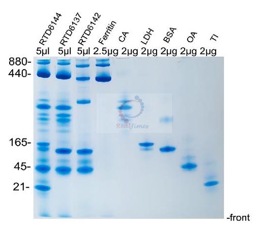 特別說(shuō)明:由于本系統(tǒng)采用非連續(xù)Laemmli凝膠系統(tǒng)(Tris-Glycine系統(tǒng)),電泳凝膠系統(tǒng)pH在8.3-8.8,因此要求待分離的蛋白等電點(diǎn)pI≤8.0(酸性蛋白),這樣蛋白在凝膠系統(tǒng)內(nèi)帶負(fù)電荷,pI越低于8.0,帶更多的負(fù)電荷,在凝膠電泳中才能正常向正極泳動(dòng)。如果待分離的蛋白等電點(diǎn)pI>8.0(堿性蛋白),請(qǐng)選擇堿性電泳凝膠系統(tǒng)分離(貨號(hào)RTD6131)。