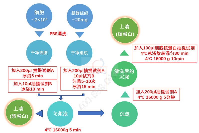 本試劑盒是通過抽提試劑A與抽提試劑B協(xié)同作用,破壞細(xì)胞膜,釋放出胞漿蛋白,然后通過離心得到細(xì)胞核;再用高鹽的細(xì)胞核蛋白抽提試劑抽提得到核蛋白。一般情況下,胞漿蛋白與核蛋白之間的交叉污染低于10%。提取得到的胞漿蛋白含有非離子去垢劑,保持了蛋白活性;提取得到的核蛋白為可溶性核蛋白(不包括核膜蛋白和核骨架蛋白),不含去垢劑,由于鹽離子濃度較高,可能需要脫鹽或稀釋后用于相關(guān)實(shí)驗(yàn)。