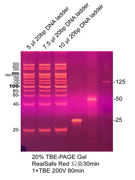 心后取5-10 μl上樣。TBE-PAGE中判斷雙鏈DNA大小可以選擇20bp DNA ladder(貨號(hào):RTM441)作為DNA Marker。