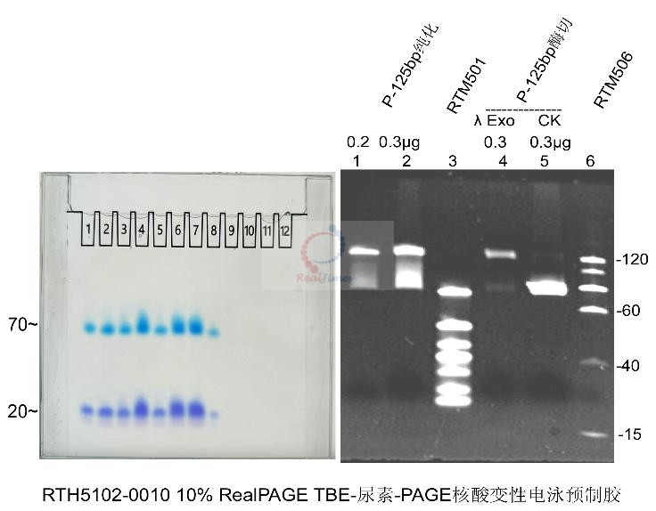 單鏈DNA或RNA樣品可以用單鏈DNA PAGE電泳染色試劑盒(貨號:RTS5103),核酸PAGE電泳染色試劑盒(貨號:RTS5102)或核酸快速高靈敏度染色試劑盒(貨號:RTS5101)染色均可以得到清晰的條帶分離效果。注:如果使用核酸染料染色,RealSafe Red(貨號:GR002)或RealSafe All(貨號:GR004)核酸染料結(jié)合單鏈核酸效果最佳,強(qiáng)烈建議使用以便獲得最佳效果的膠圖。其余染料如GelRed,Goldview,EB等染色效果不好。