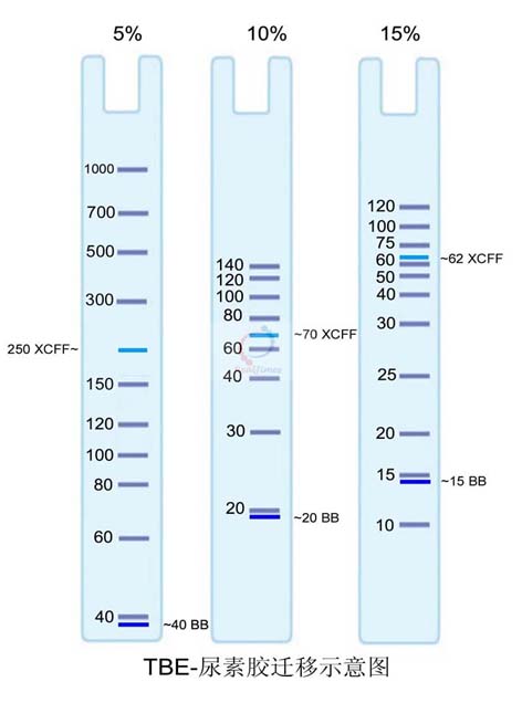 取 5×TBE(貨號:TB001),加入去離子水稀釋為1×,制備成 1×TBE buffer。對于RNA樣品電泳,取5×TBE(RNase-free)(貨號:TB001F),加入RNase-free水/DEPC水(貨號:RF001-02)稀釋為 1×,制備成 1×TBE buffer。