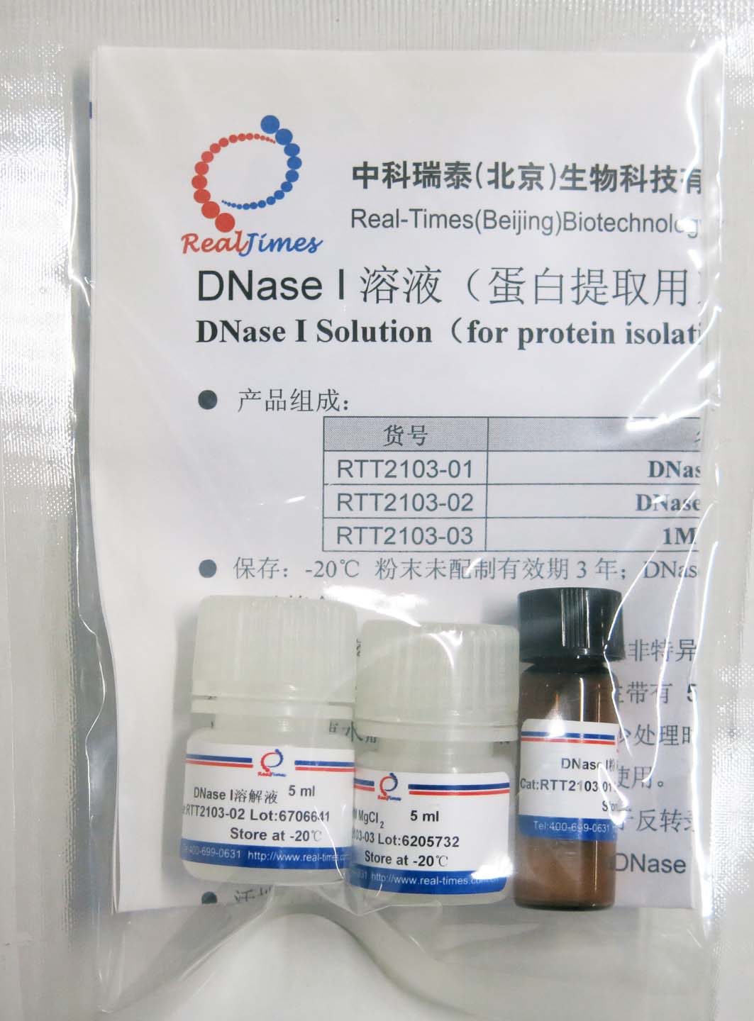 1、DNase I溶液的配制:取5ml DNase I溶解液全部加到DNase I粉末中,充分混勻,配成濃度為2000U/ml DNase I溶液。-20℃貯存。