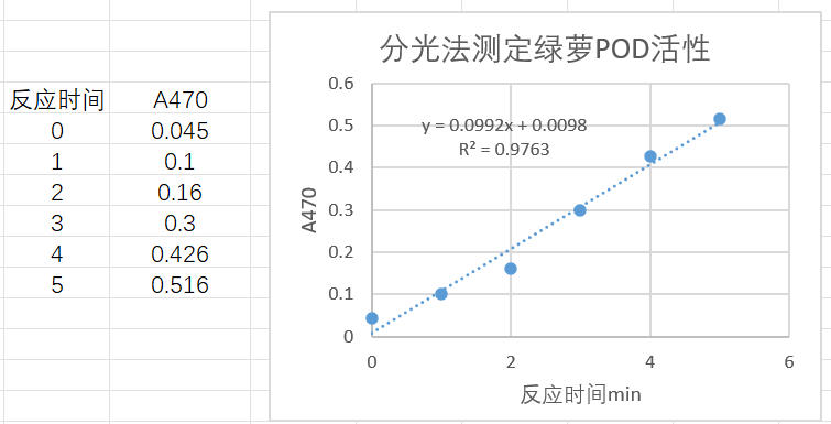 取0.5 克綠蘿葉片(FW=0.5),加入5 ml提取液(V總=5)冰浴勻漿,制成10%勻漿液,12000 rpm 4℃離心10 min,取上清置于冰上,取50 μl樣本(V樣=0.05)按照測定步驟操作,使用1 ml石英比色皿(光徑1 cm),設(shè)定分光光度計檢測波長470 nm,間隔1 min記錄數(shù)據(jù),采集5次;時間對吸光值做線性回歸曲線,3-4 min線性較好,1 min內(nèi)△A=0.426-0. 3=0.126。計算POD(U/g FW)=0.126/0.5×1/1×5/0.05×1= 25.2 U/g FW